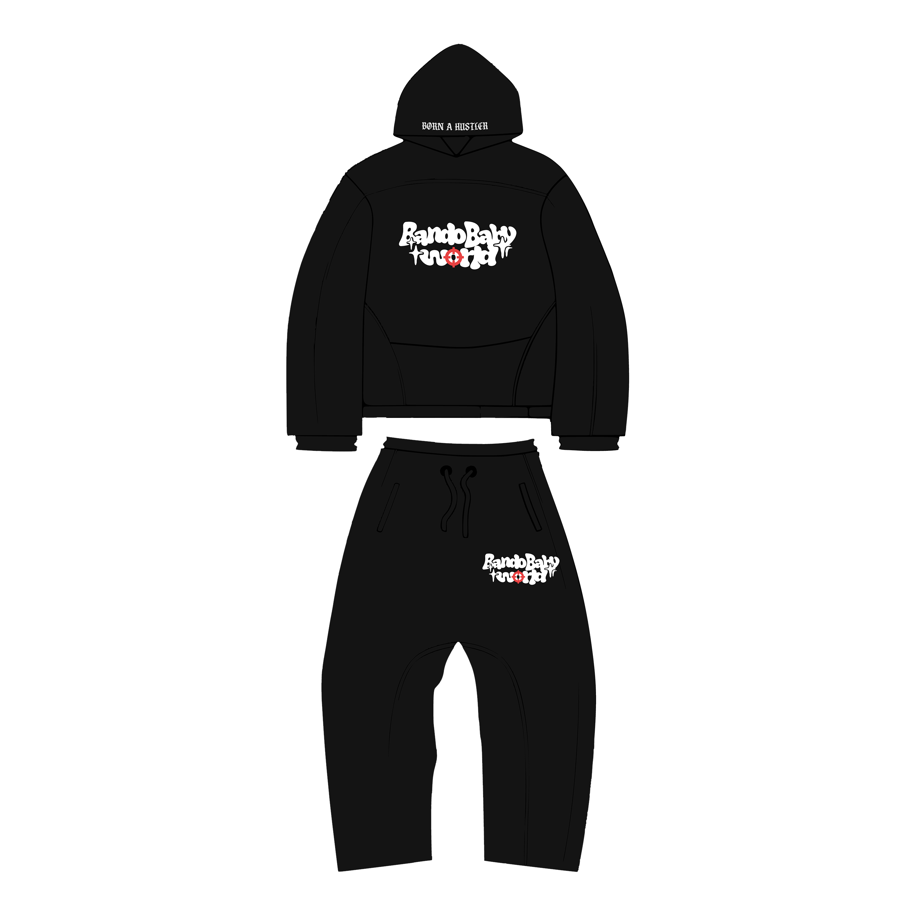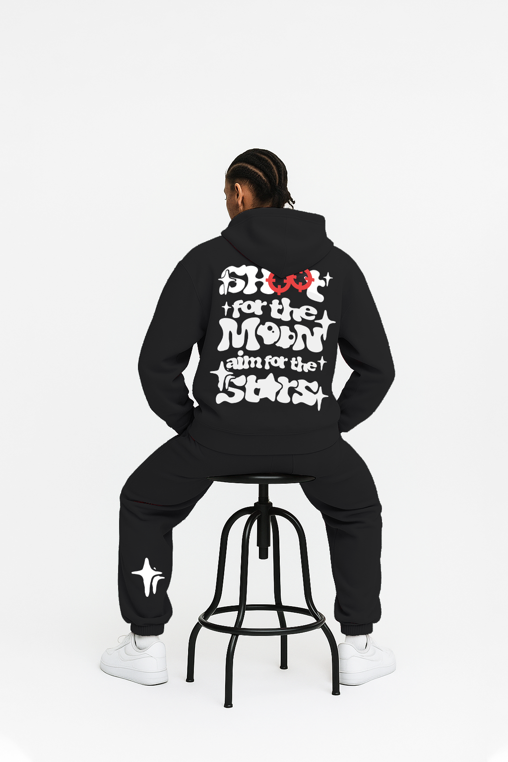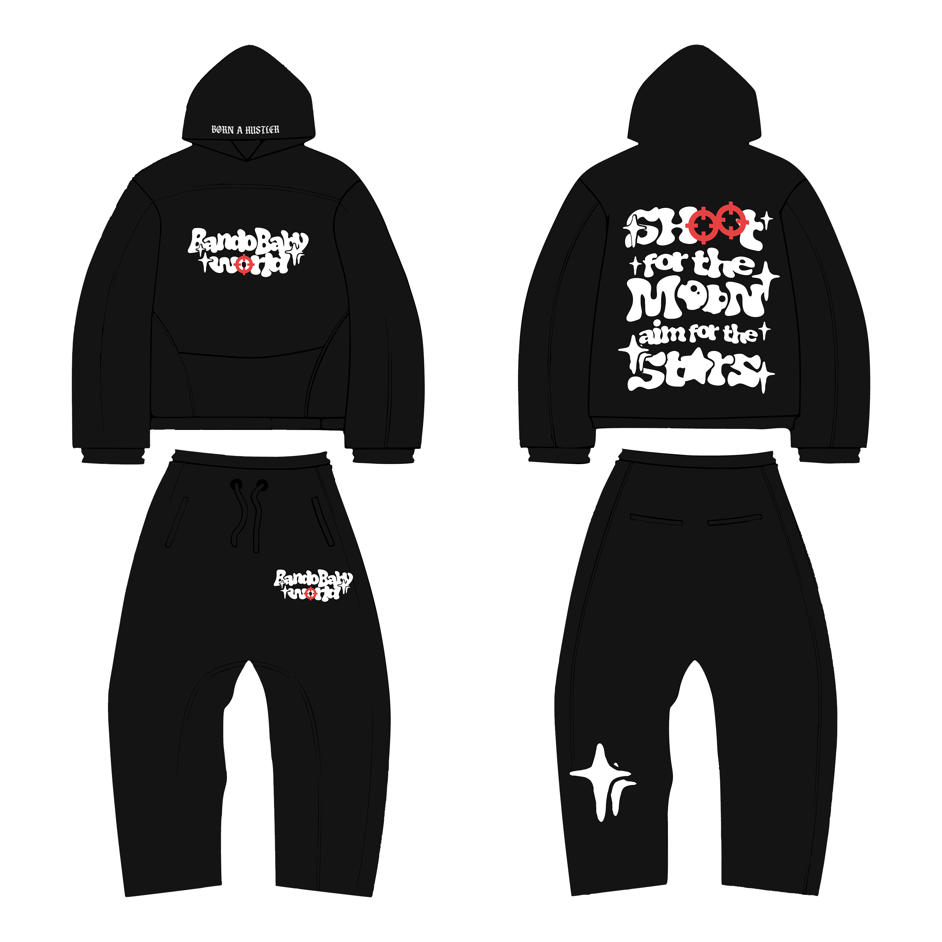 Dream loud, move bold. The Bando Baby Aim Edition tracksuit brings together street energy and motivational flair, featuring the signature Bando Baby logo up front and a powerful “Shoot for the Moon, Aim for the Stars” graphic across the back. Subtle star hits on the joggers tie the whole look together, making this set a statement for hustlers who grind with vision.