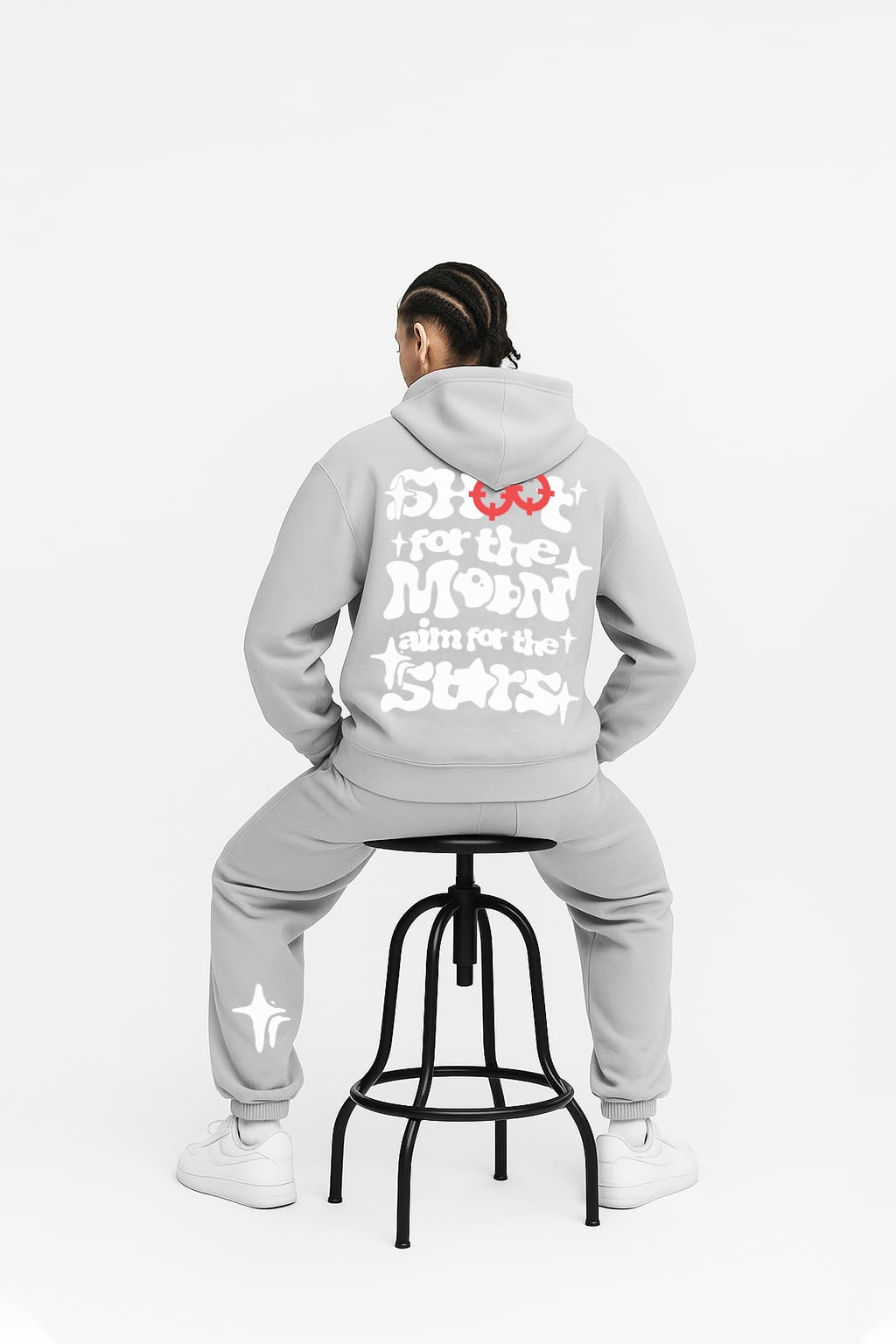 Dream loud, move bold. The Bando Baby Aim Edition tracksuit brings together street energy and motivational flair, featuring the signature Bando Baby logo up front and a powerful “Shoot for the Moon, Aim for the Stars” graphic across the back. Subtle star hits on the joggers tie the whole look together, making this set a statement for hustlers who grind with vision.