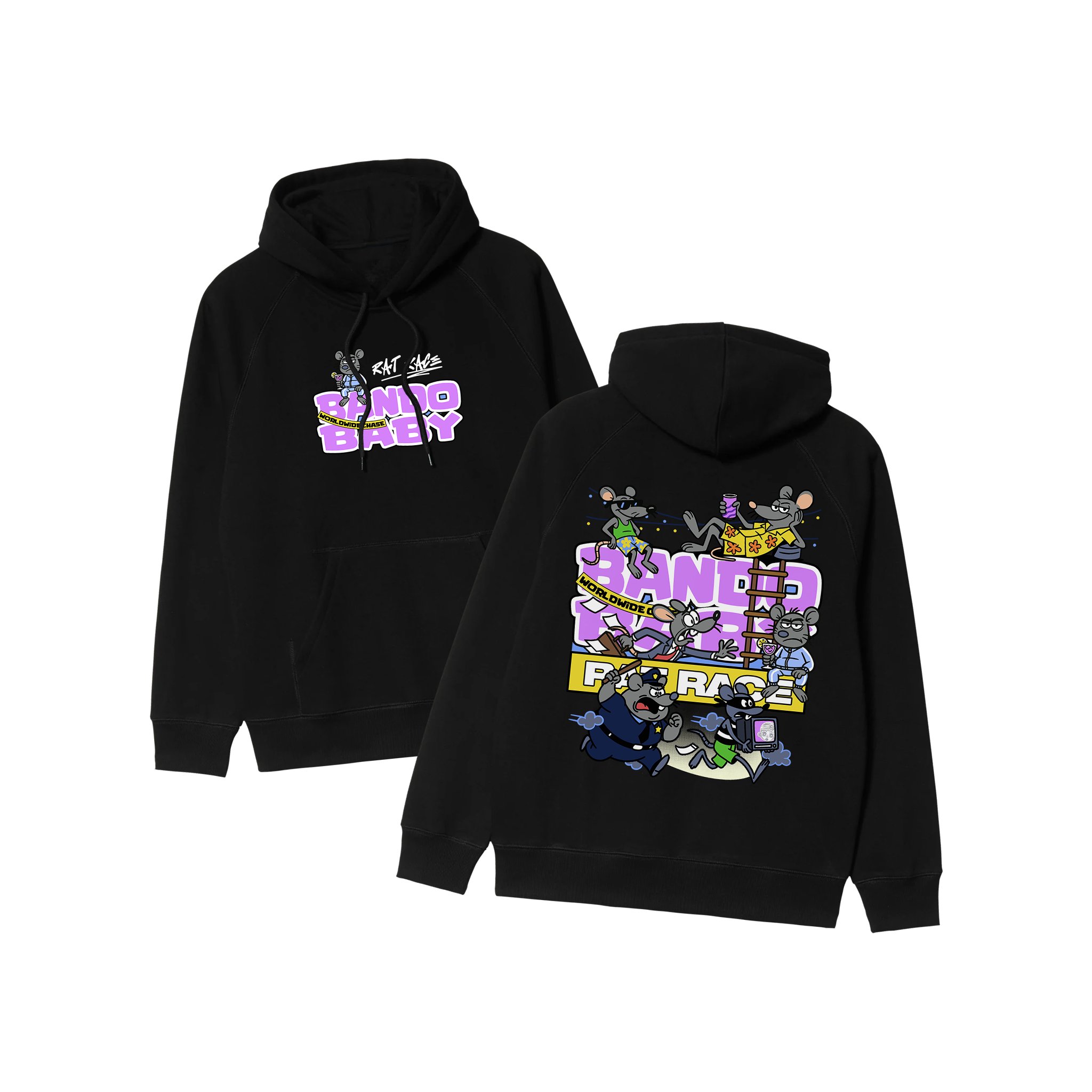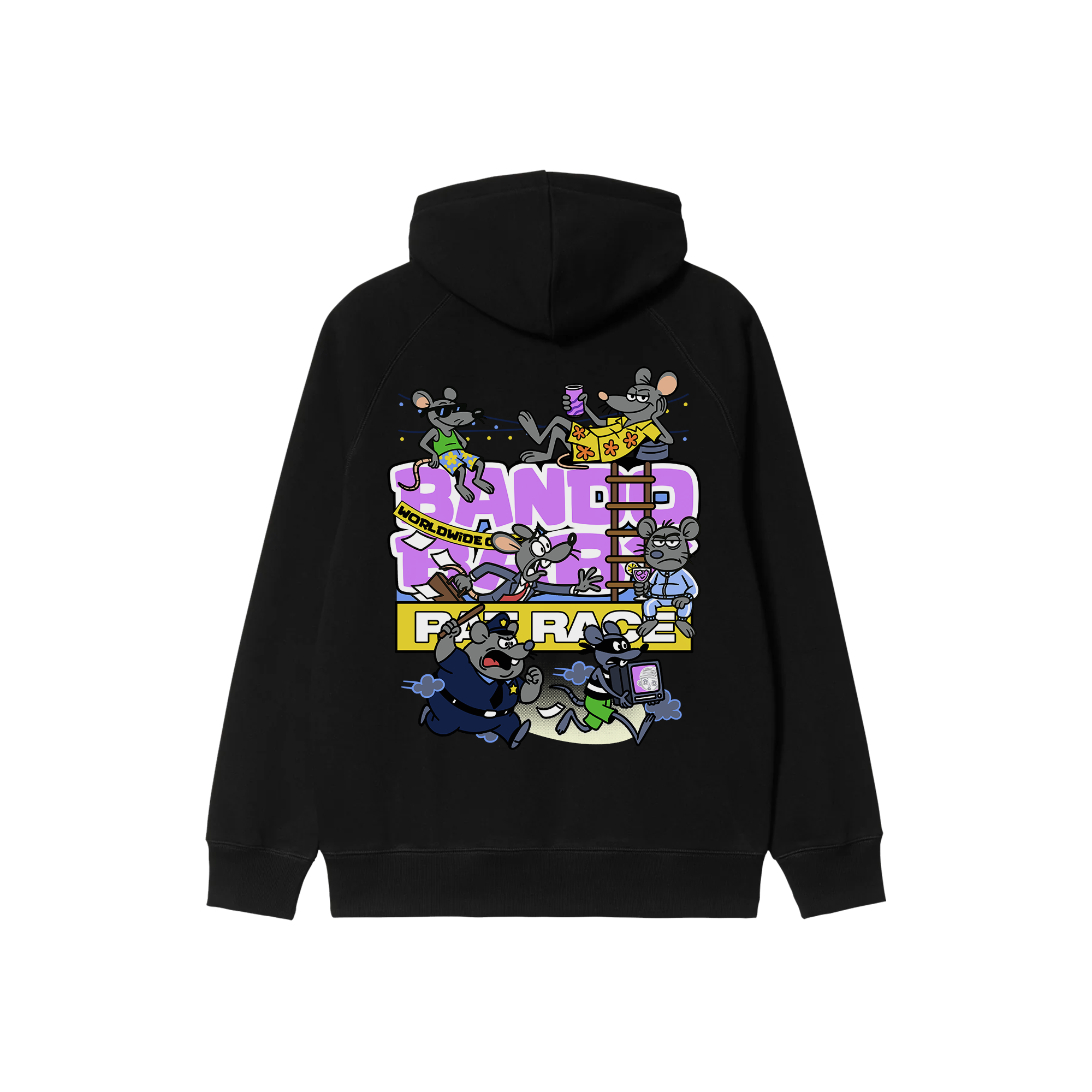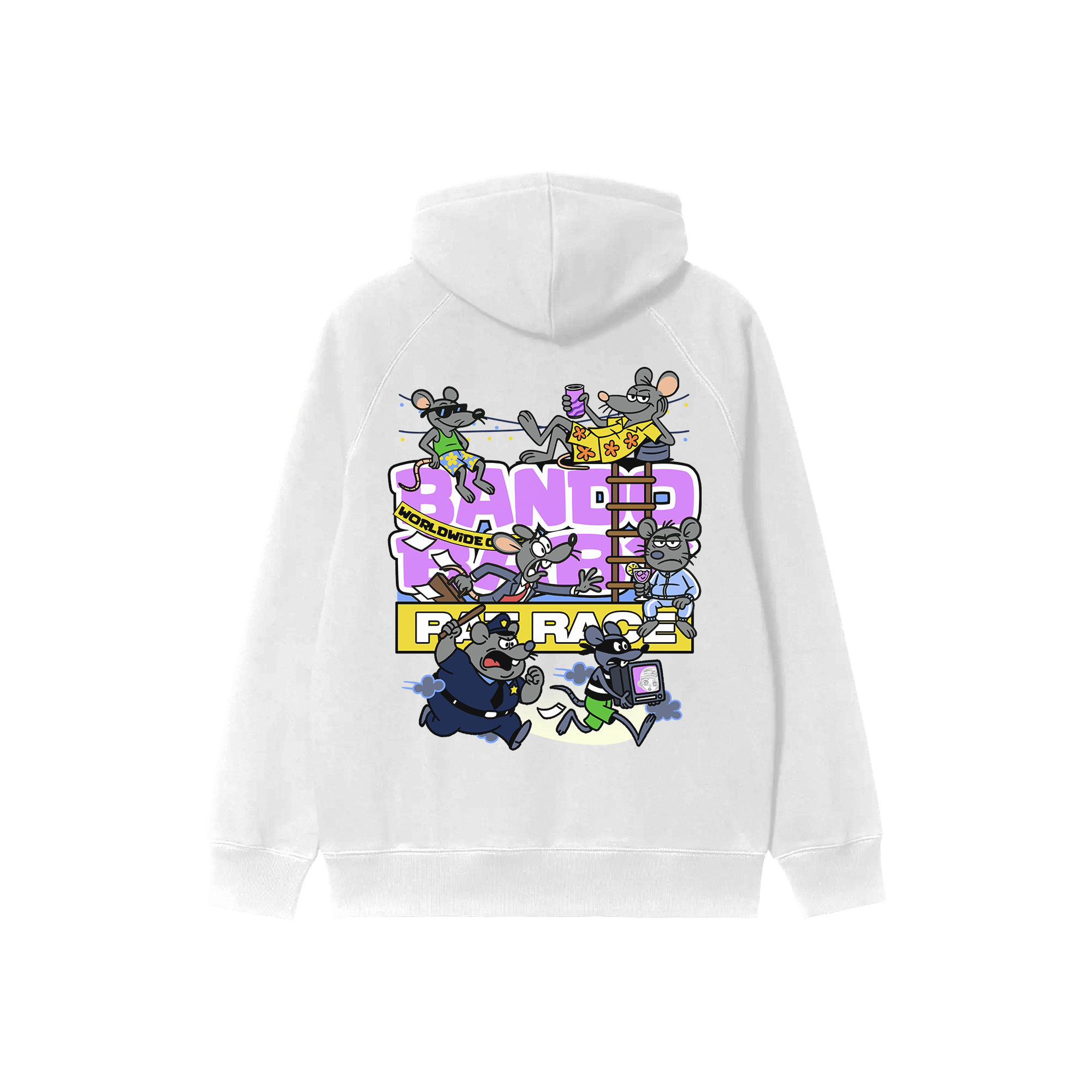 An exciting and cosmopolitan collection that celebrates the spirit of exploration, cultural diversity, and the boundless possibilities of the world. Featuring the Bando Baby “Rat Race” cartoon graphic on the back with multiple characters hustling, running, and climbing, paired with the Rat Race Bando Baby logo print on the front chest.
