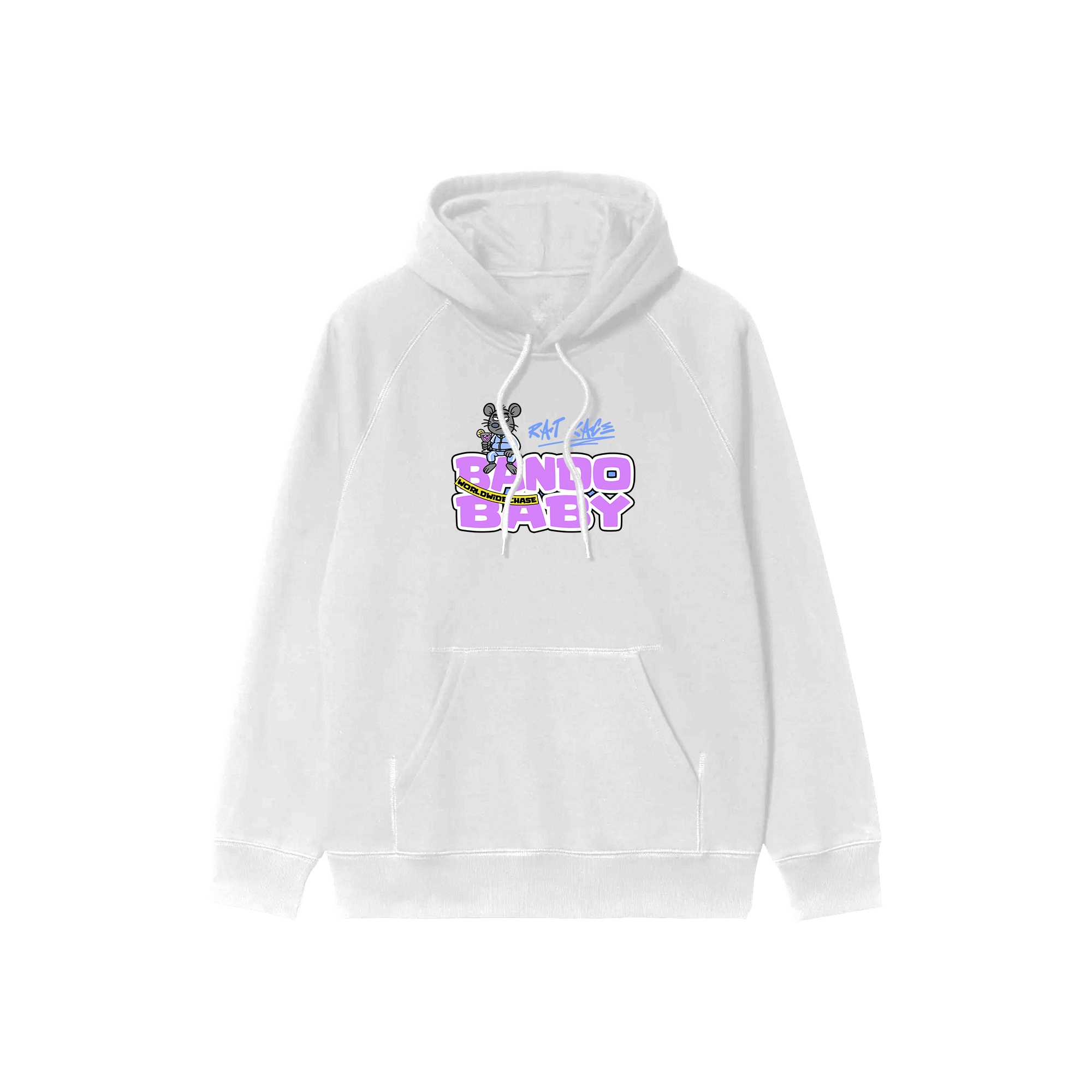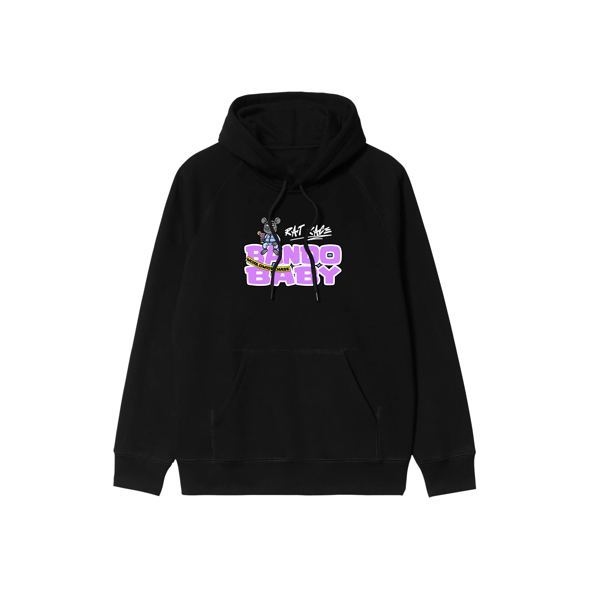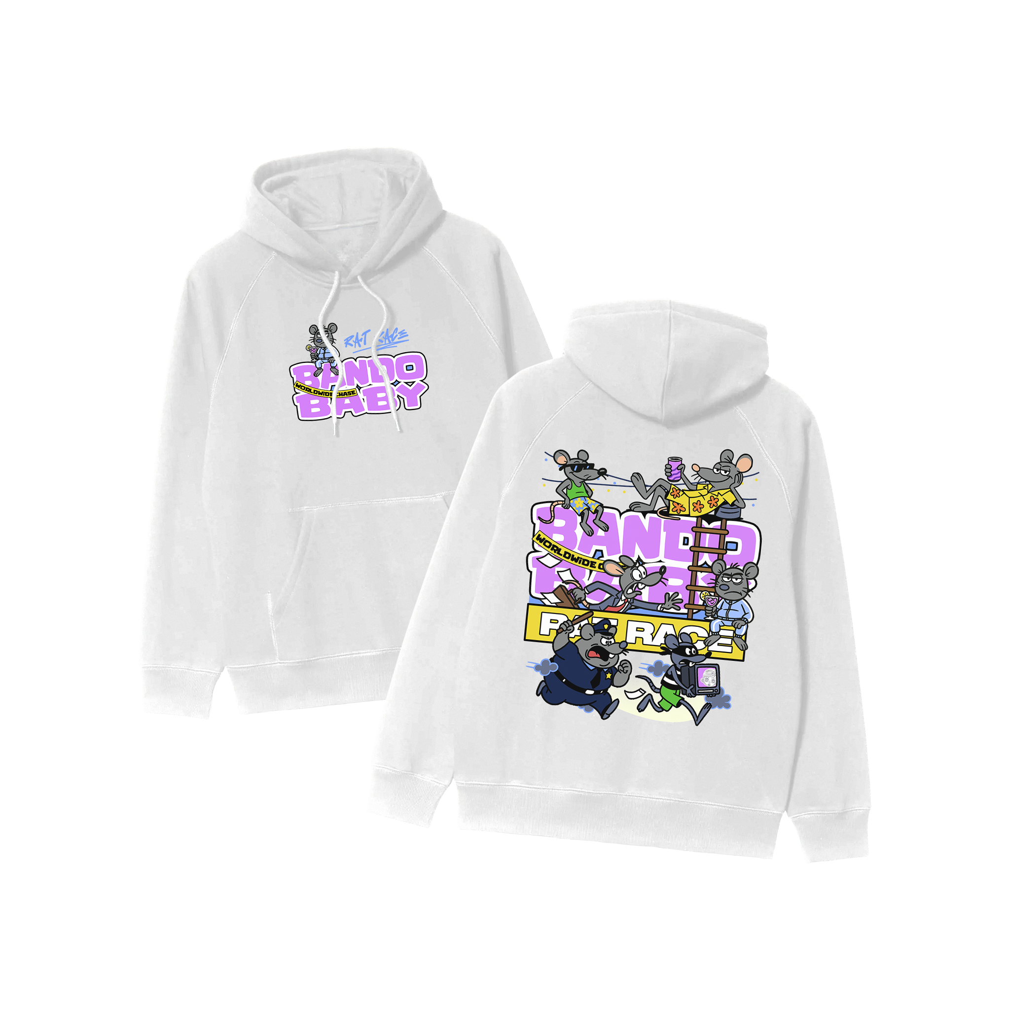 An exciting and cosmopolitan collection that celebrates the spirit of exploration, cultural diversity, and the boundless possibilities of the world. Featuring the Bando Baby “Rat Race” cartoon graphic on the back with multiple characters hustling, running, and climbing, paired with the Rat Race Bando Baby logo print on the front chest.