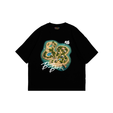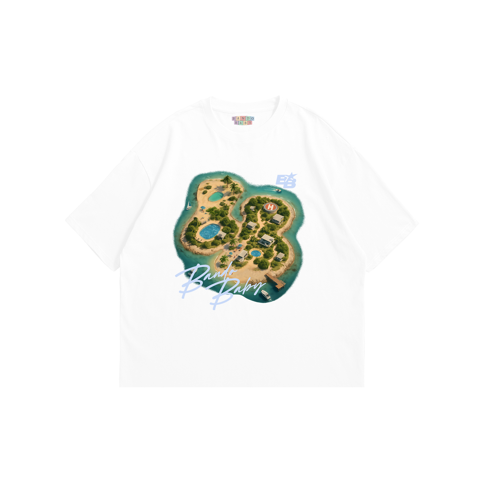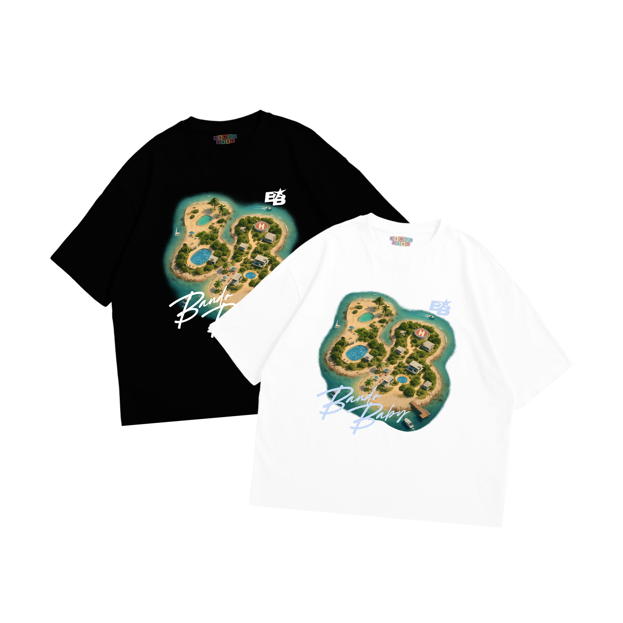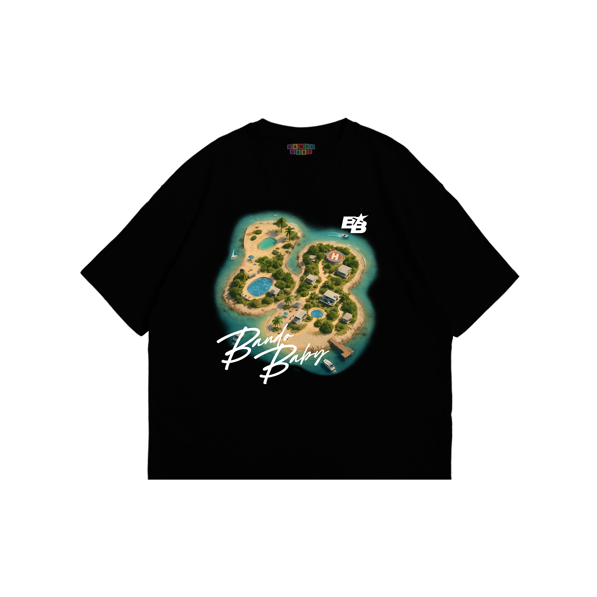 Featuring a Bando Baby tropical island map graphic shaped like “BB” across the front, with detailed beach, palm trees, pools, and signature Bando Baby branding.