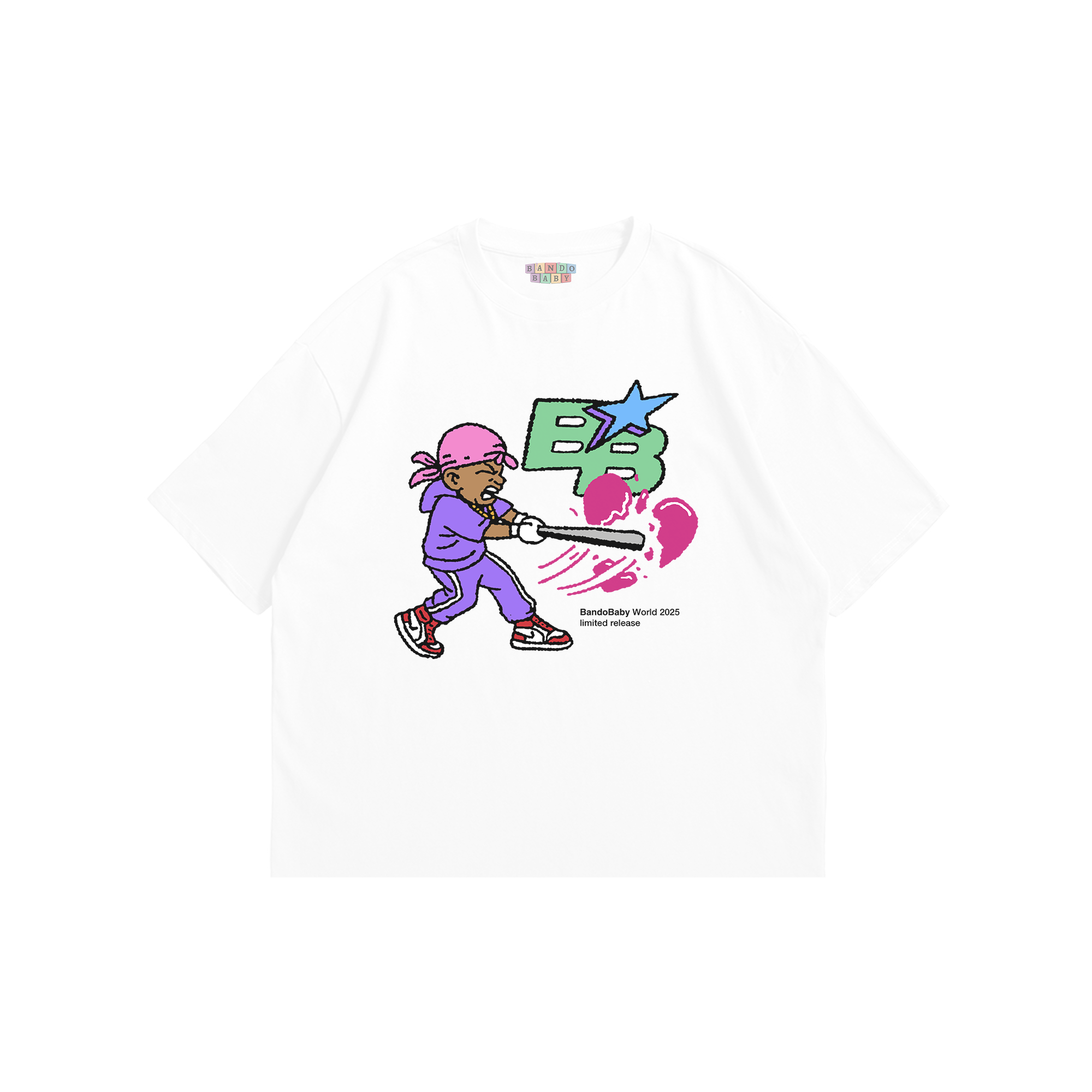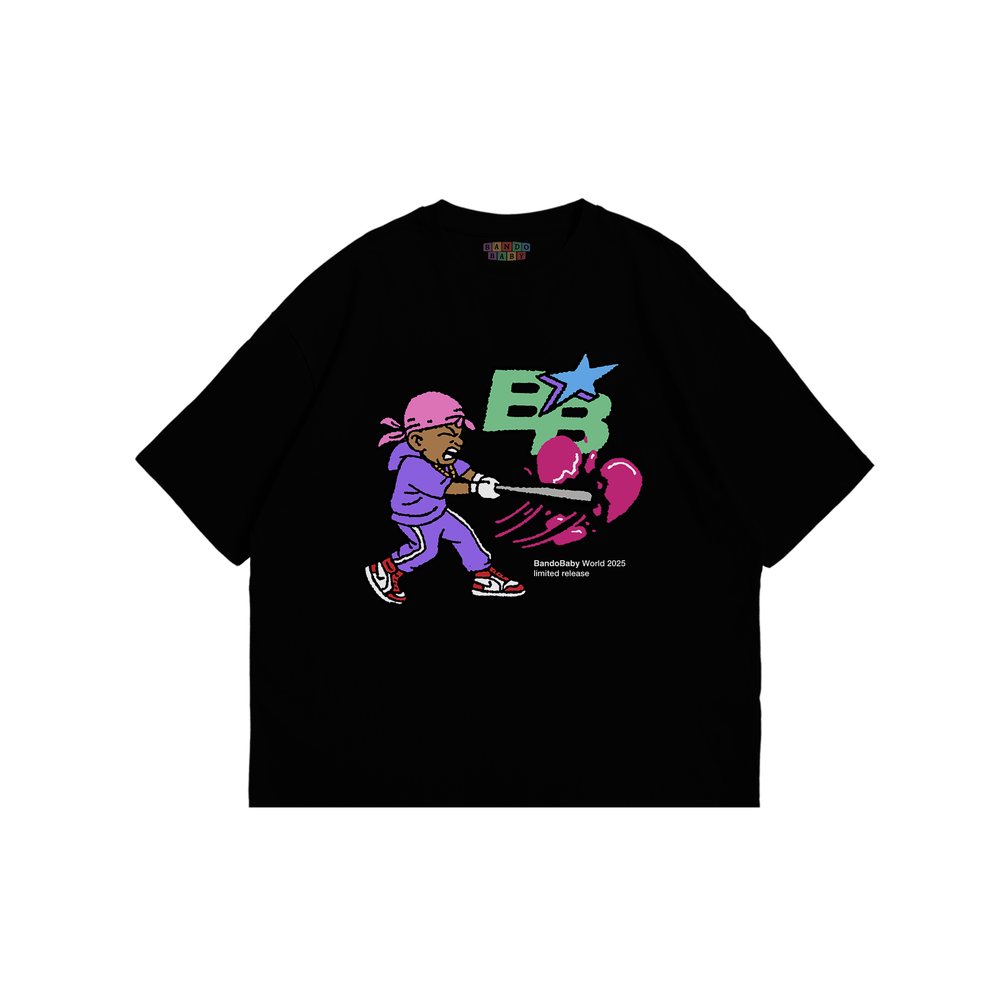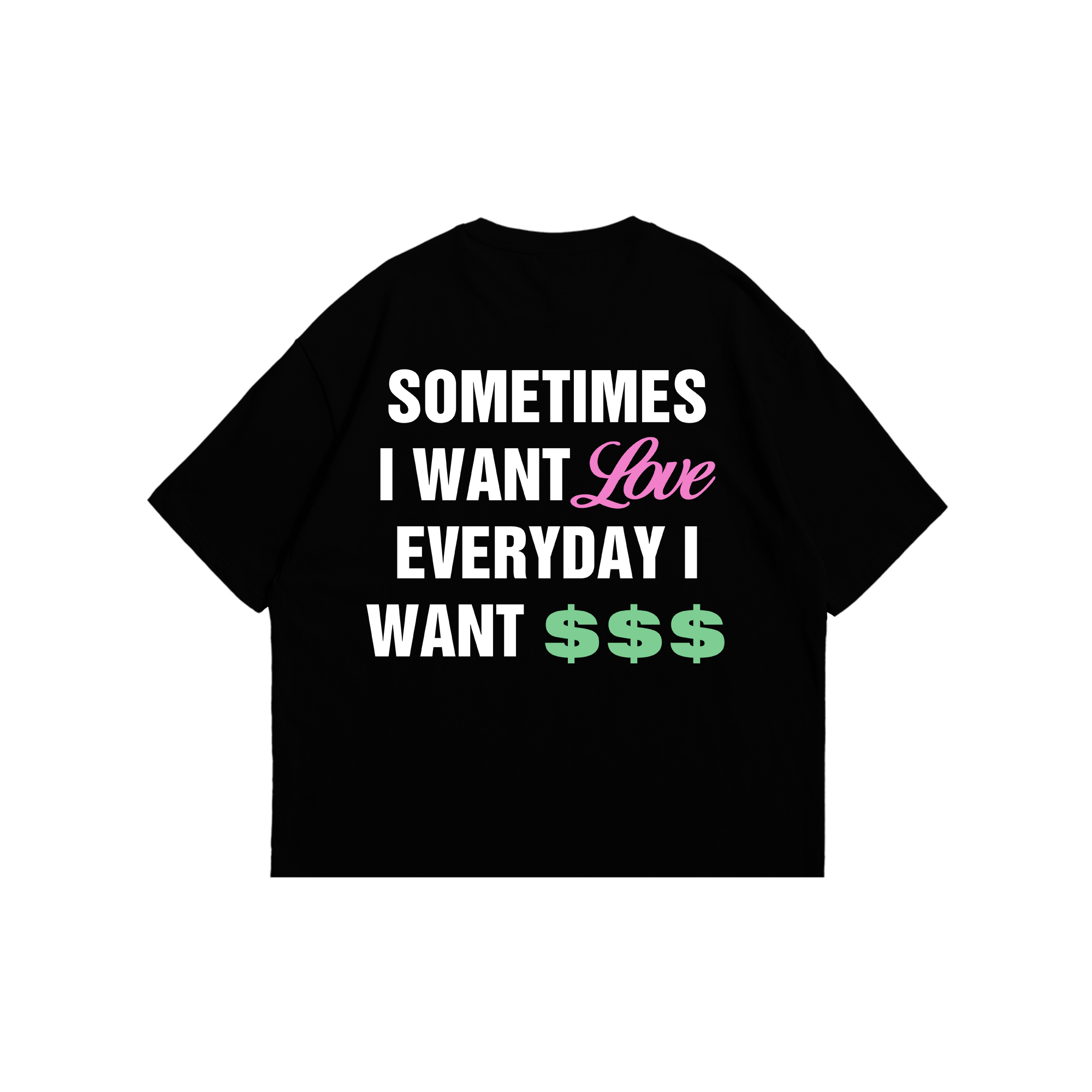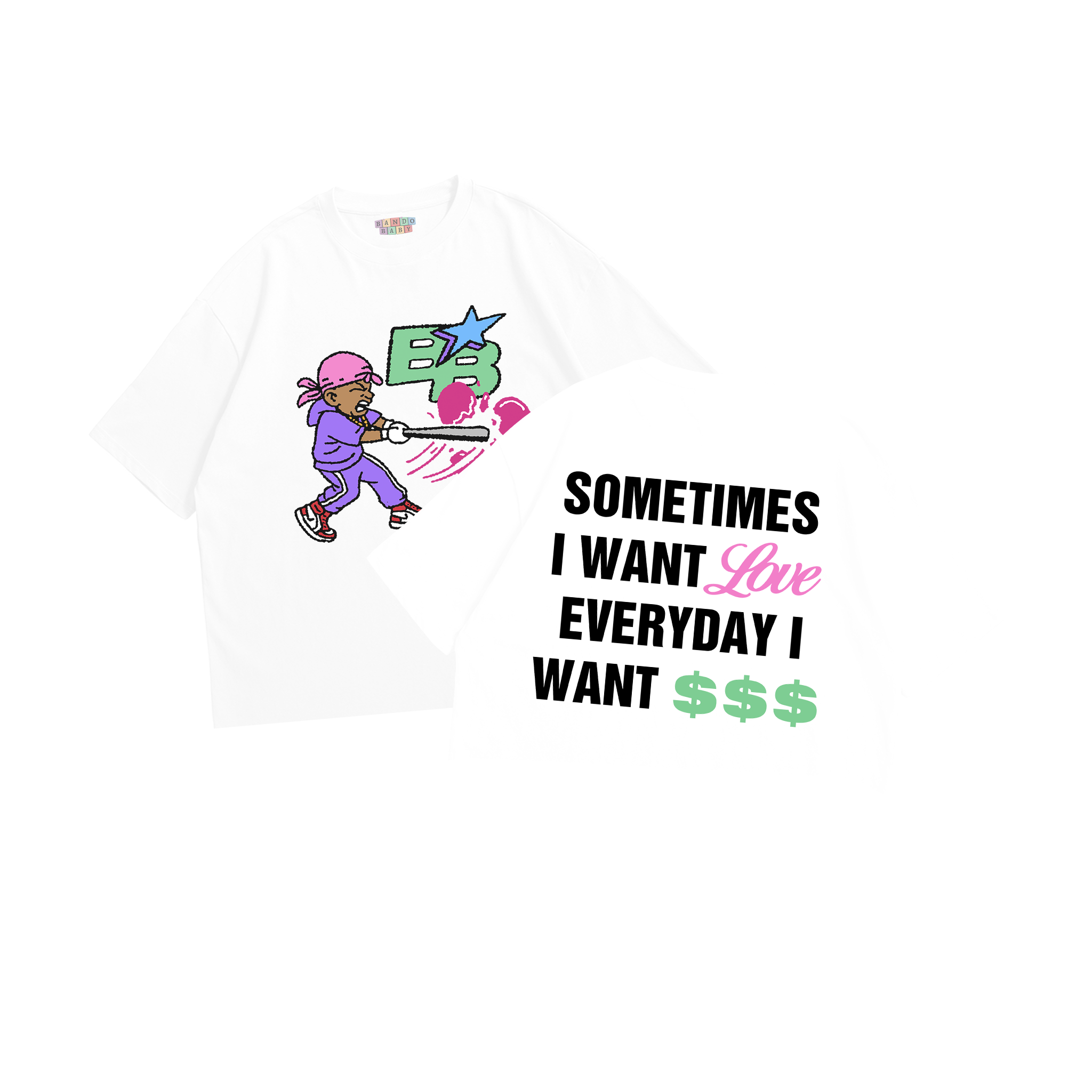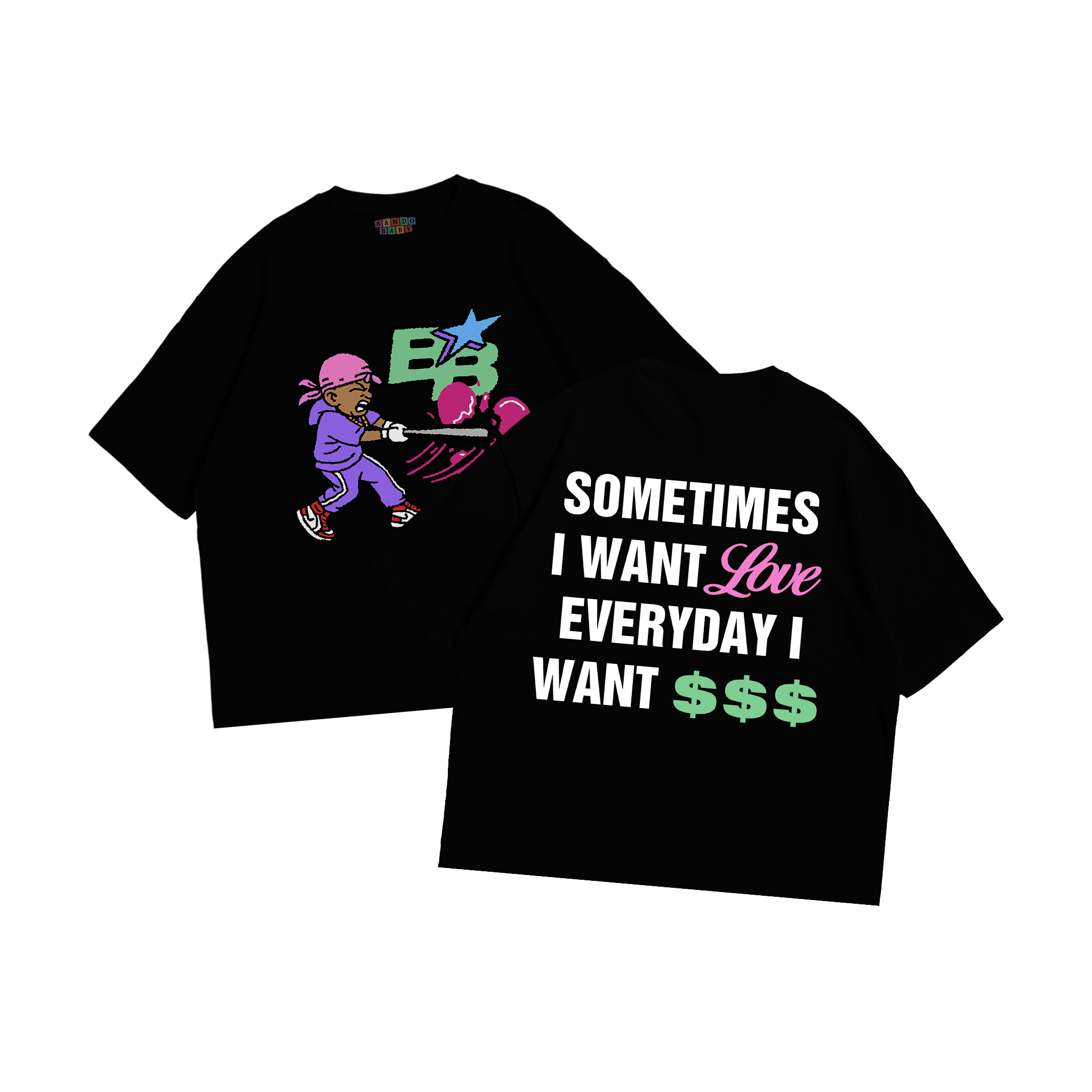 Featuring Bando Baby character with bat & BB star logo print on the front and bold “Sometimes I Want Love, Everyday I Want $$$” text graphic on the back.