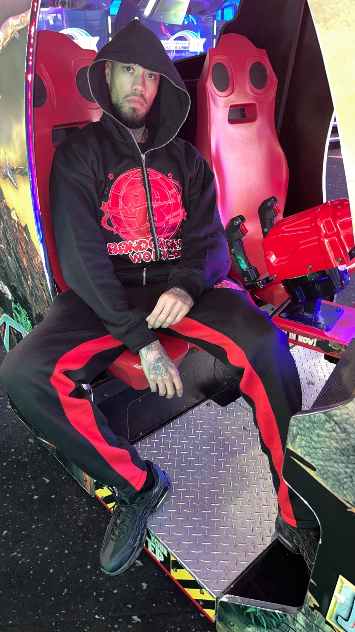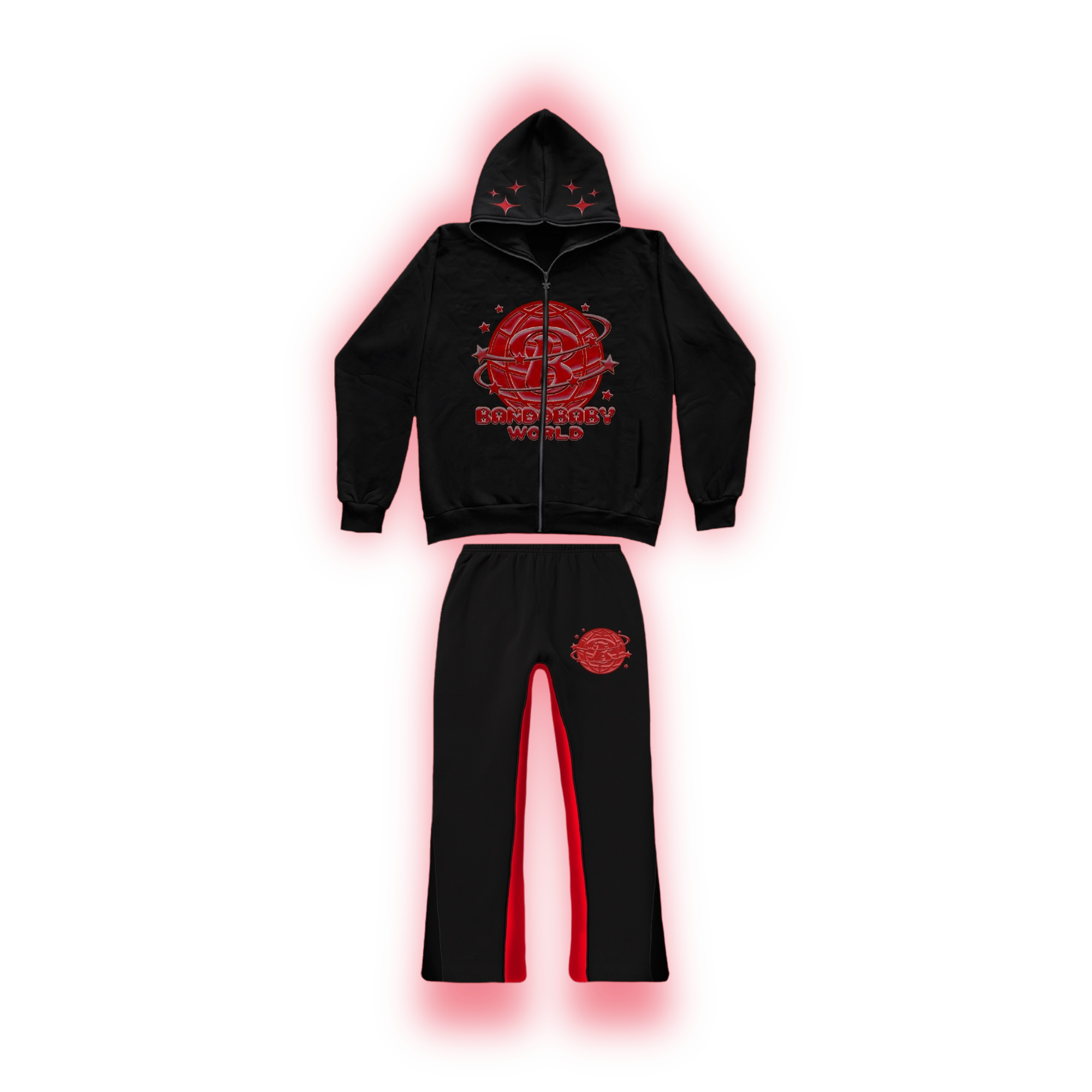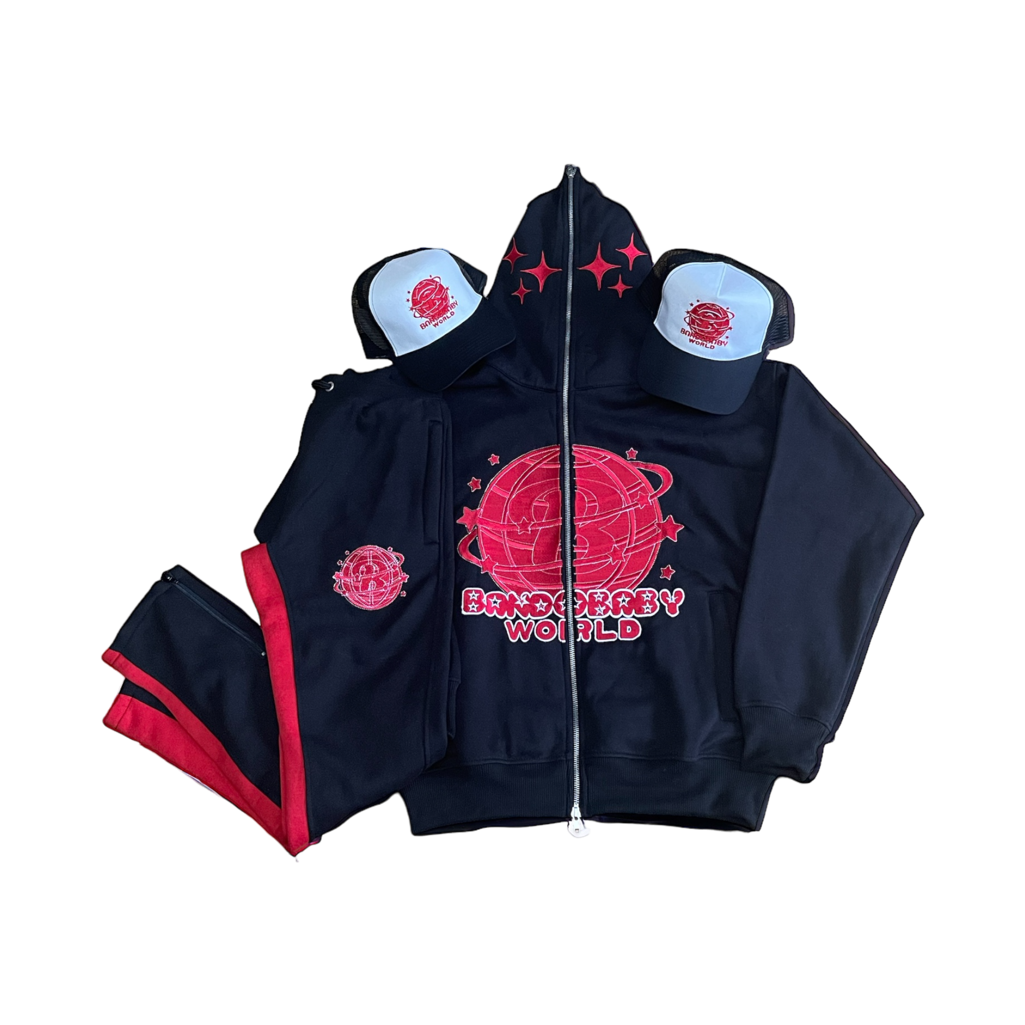 Our Bando Baby World Tracksuits feature a comfortable yet stylish design. The joggers showcase the duo colour running through the tracksuit. The zip up jacket boasts a premium feel with the design embroidered to the centre of the hoodie & also embroidered on the hood itself which is accompanied by joggers which have zips to allow a flared look or not.